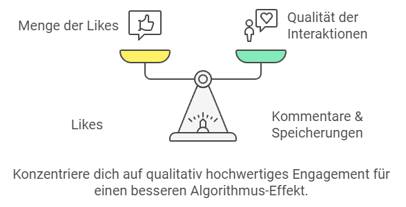 Engagement bedeutet, dass deine Follower mit deinen Inhalten interagieren. Dazu gehören Likes, Kommentare, das Speichern und Teilen deiner Beiträge. Klar, Likes sind schön – aber es sind die Kommentare und Speicherungen, die wirklich zählen. Sie signalisieren Instagram, dass deine Inhalte gut ankommen. Hast du das schon gewusst? Je intensiver die Interaktion, desto besser bewertet der Algorithmus deinen Content. Das sorgt dann dafür, dass deine Beiträge auch von mehr Menschen gesehen werden.